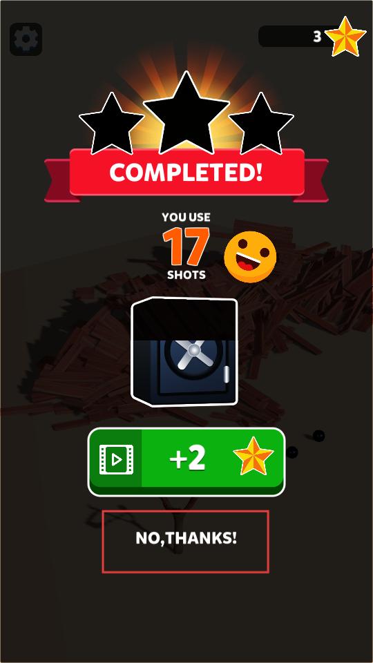 4、当建筑被完全破坏后,会显示COMPLETED的提示,可选择是否观看视频获取额外奖励,若不选择,点击NO THANKS按钮。