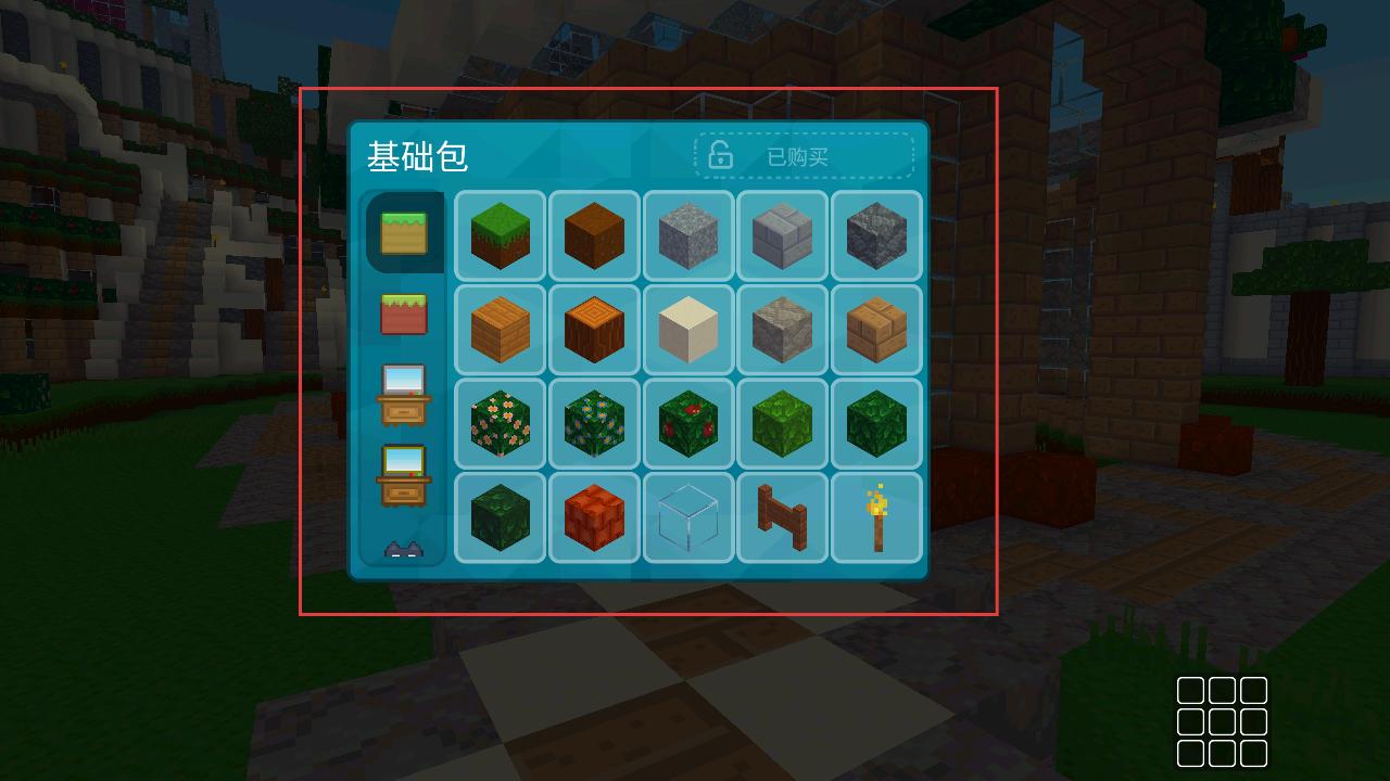 3、在仓库的基础包中有草地、泥土、石块等多种方块,可选择需要的方块,为建造收集材料。