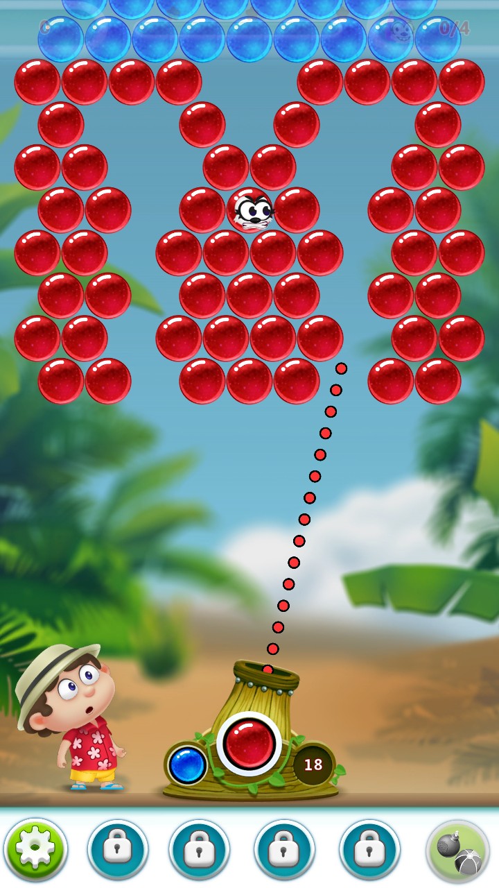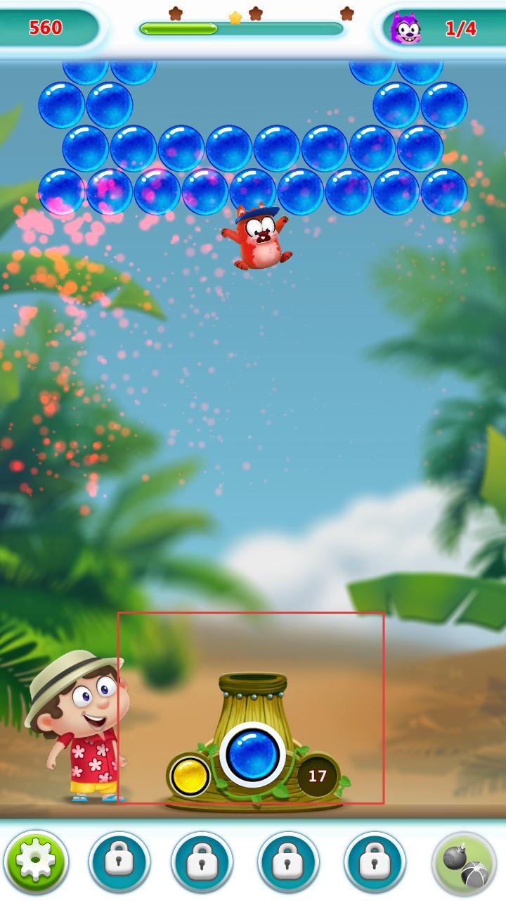 2、进入关卡后,会看到屏幕上方有不同颜色的泡泡排列着,还有带特殊图案的泡泡,需要瞄准相同颜色的泡泡发射。