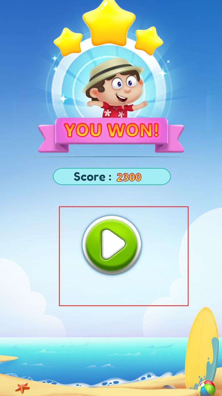 4、当成功消除足够多的泡泡,完成关卡目标后,会显示YOU WON的胜利界面,此时点击绿色按钮,可进入下一关继续挑战。
