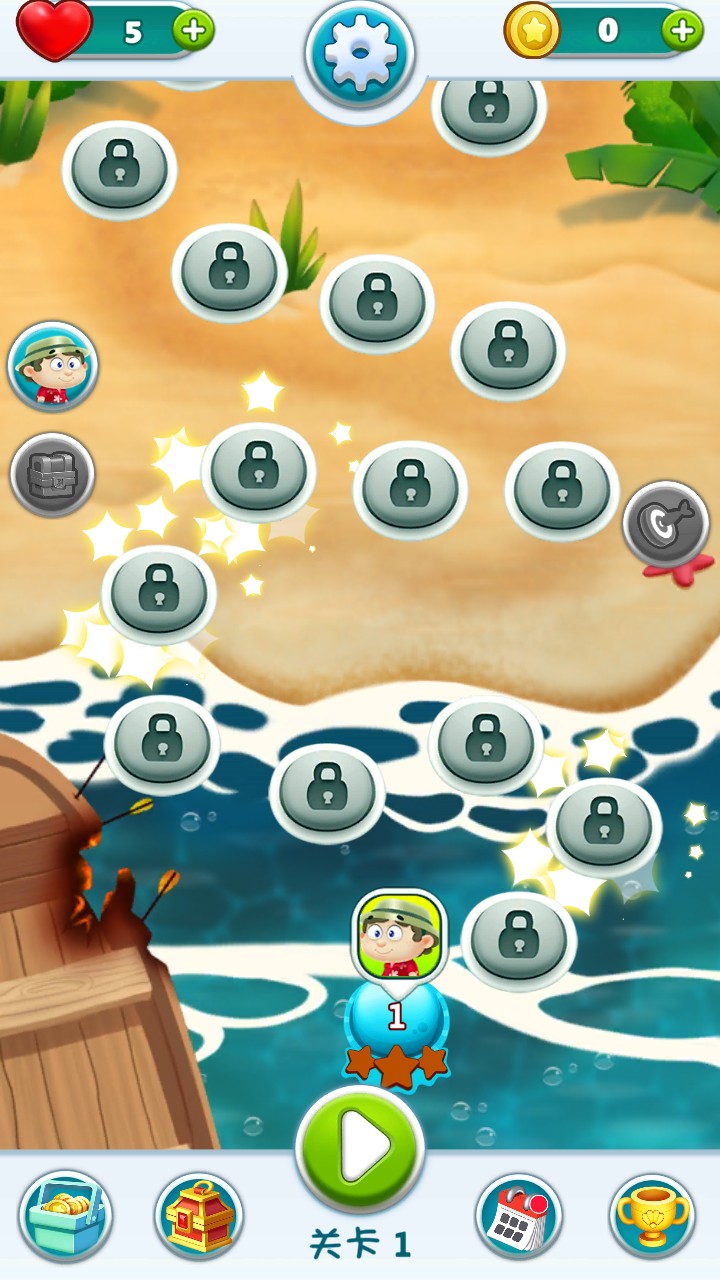 2、特殊关卡需要解救被困在泡泡中的海洋生物,优先清除阻挡路径的关键泡泡,并根据剩余步数规划最优救援路线。