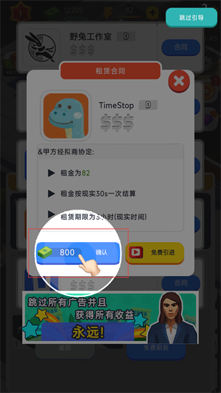 2、在租赁合同界面点击确认按钮,消耗对应资源达成合作,确定与TimeStop的租赁协议。