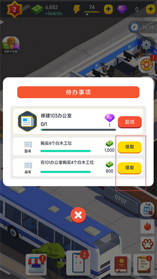 4、在待办事项界面点击领取按钮,获取完成任务对应的资源奖励,推进楼宇建设进度。