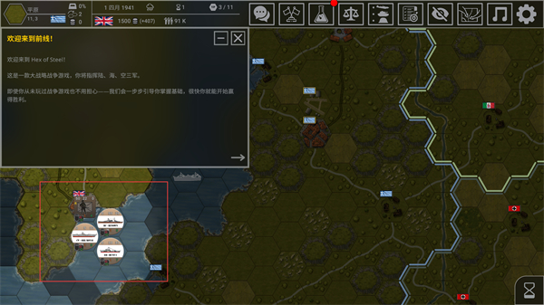 2、查看初始战场的部队分布,选择对应的作战单位,规划其在六角地块上的移动路线与进攻方向。