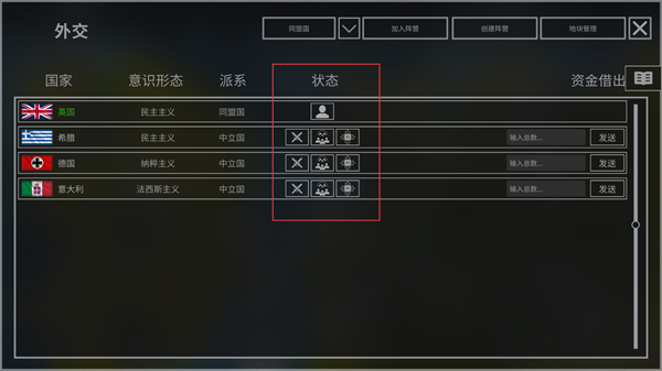 4、进入外交界面查看各国状态,了解不同国家的派系与意识形态,为后续的外交互动做准备。