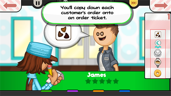 2、接待顾客James,将他的甜甜圈订单需求记录到order ticket上,明确制作的口味与样式要求。