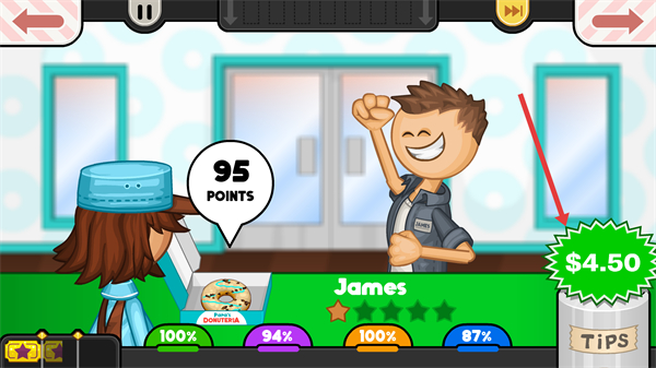 4、将做好的甜甜圈递给James,查看获得的95POINTS评分与收益,了解本次订单的完成情况。