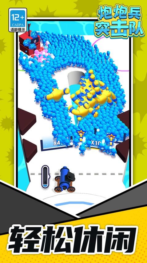 《炮炮兵突击队》是一款竖屏休闲冒险闯关游戏,语言为中文。核心玩法为指挥小兵军团冲锋,攻占敌人塔楼掠夺人口扩充兵力,避开红色大门减少兵力损耗。关卡融入路线抉择设计,不同路径对应不同挑战与收益,需权衡风险规划前进方向。战斗中触发增益道具,助力突破防御与扩充军团规模,Q版卡通画风搭配轻快音效,操作仅需滑动屏幕控制移动,规则直观流程顺畅,支持单机离线游玩,适配短时休闲场景,通关解锁新关卡与专属奖励,带来策略冲锋乐趣。