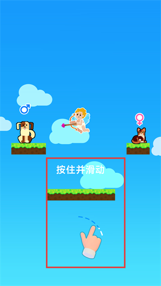 2、按照提示按住并滑动界面,控制丘比特的发射方向,瞄准目标区域准备触发合成相关的交互。