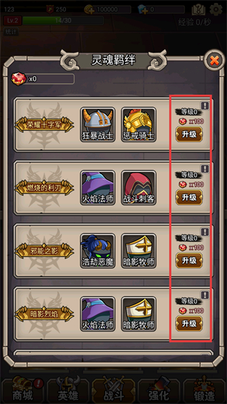 4、进入灵魂羁绊界面,点击对应羁绊右侧的升级按钮,消耗资源提升羁绊等级,增强对应英雄属性。