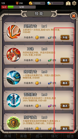2、进入技能界面,点击英雄打击的升级按钮,消耗对应资源升级该技能,提升其造成的物理伤害。