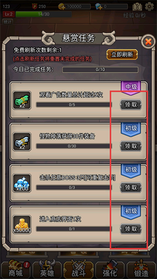 3、在悬赏任务界面,选择对应任务右侧的领取按钮,获取任务奖励,积累游戏内的资源。