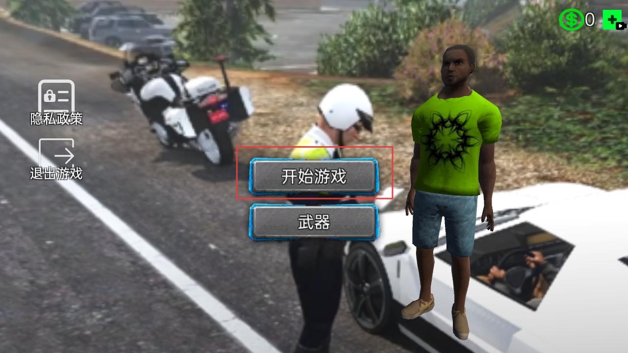 1、进入游戏,看到有警察、摩托车和汽车的界面,点击开始游戏,开启在城市中执行任务的执法之旅。