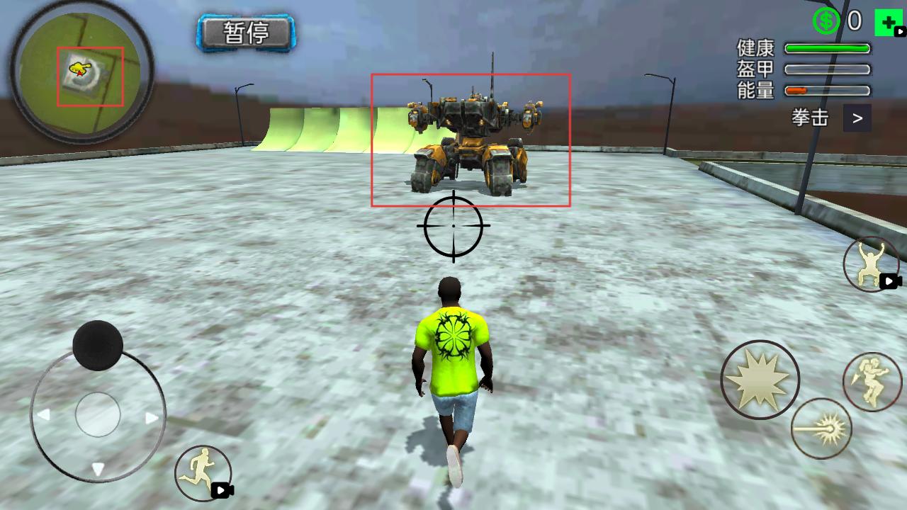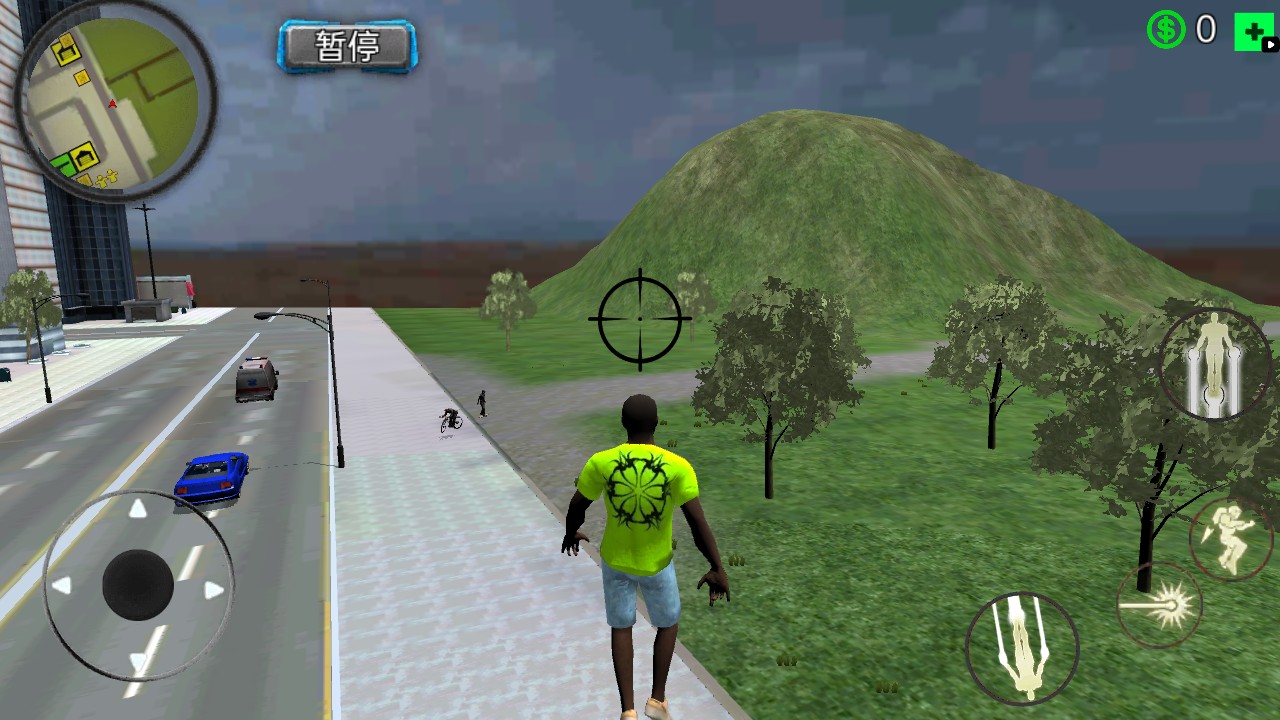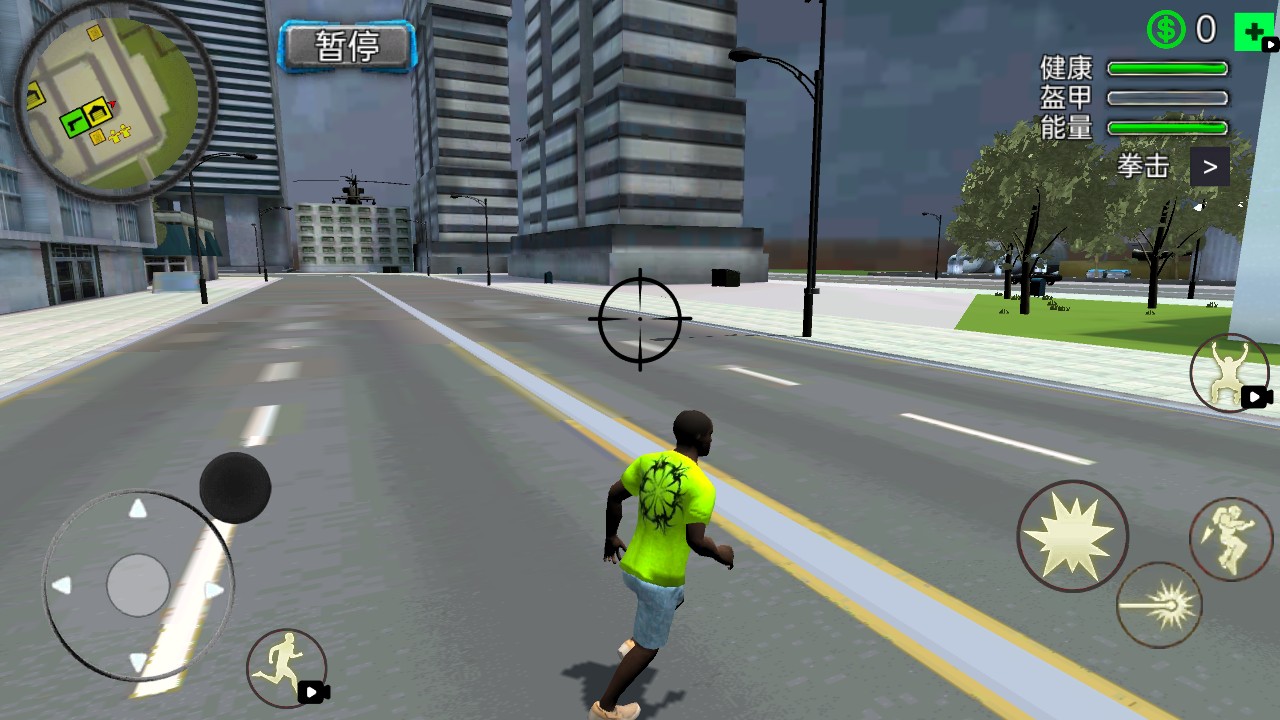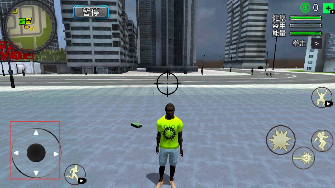 2、在城市场景里通过左侧摇杆控制角色移动,右侧有拳击等动作按钮,可在城市中自由行动,探索环境。