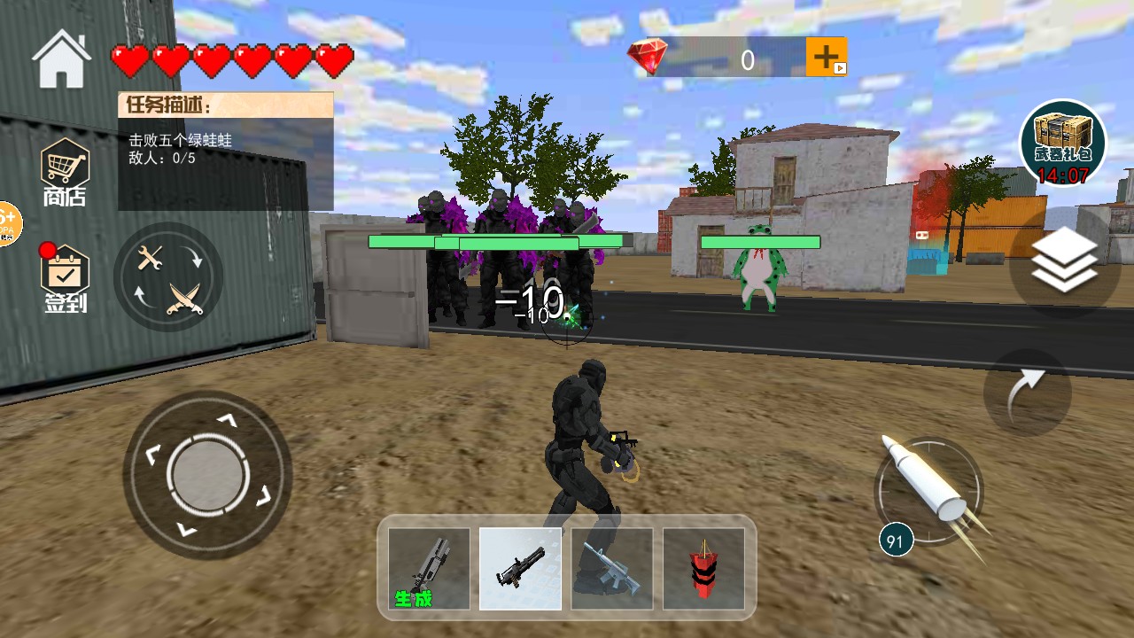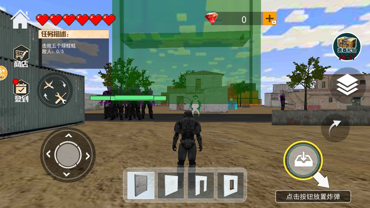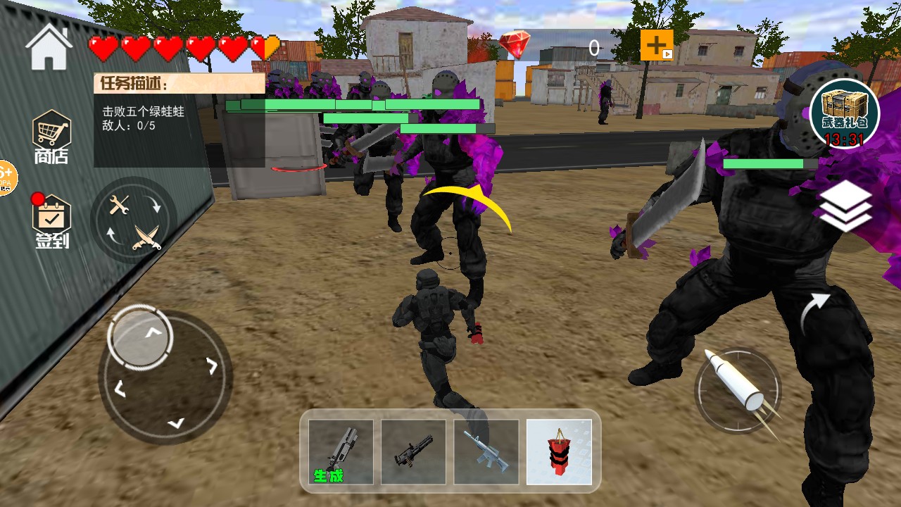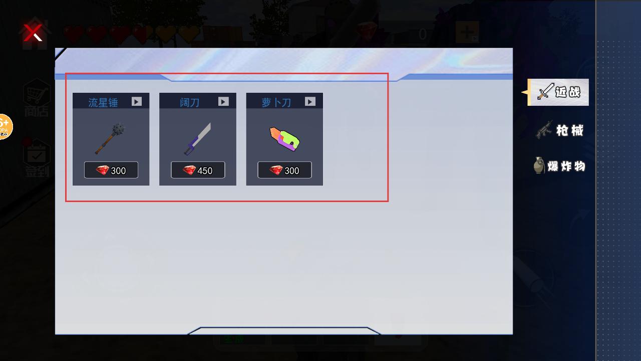 4、进入商店,能用钻石购买流星锤、阔刀、萝卜刀等近战武器,也能选择枪械、爆炸物,提升战斗能力。
