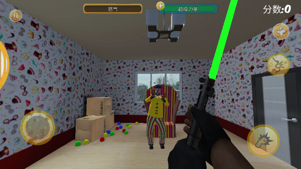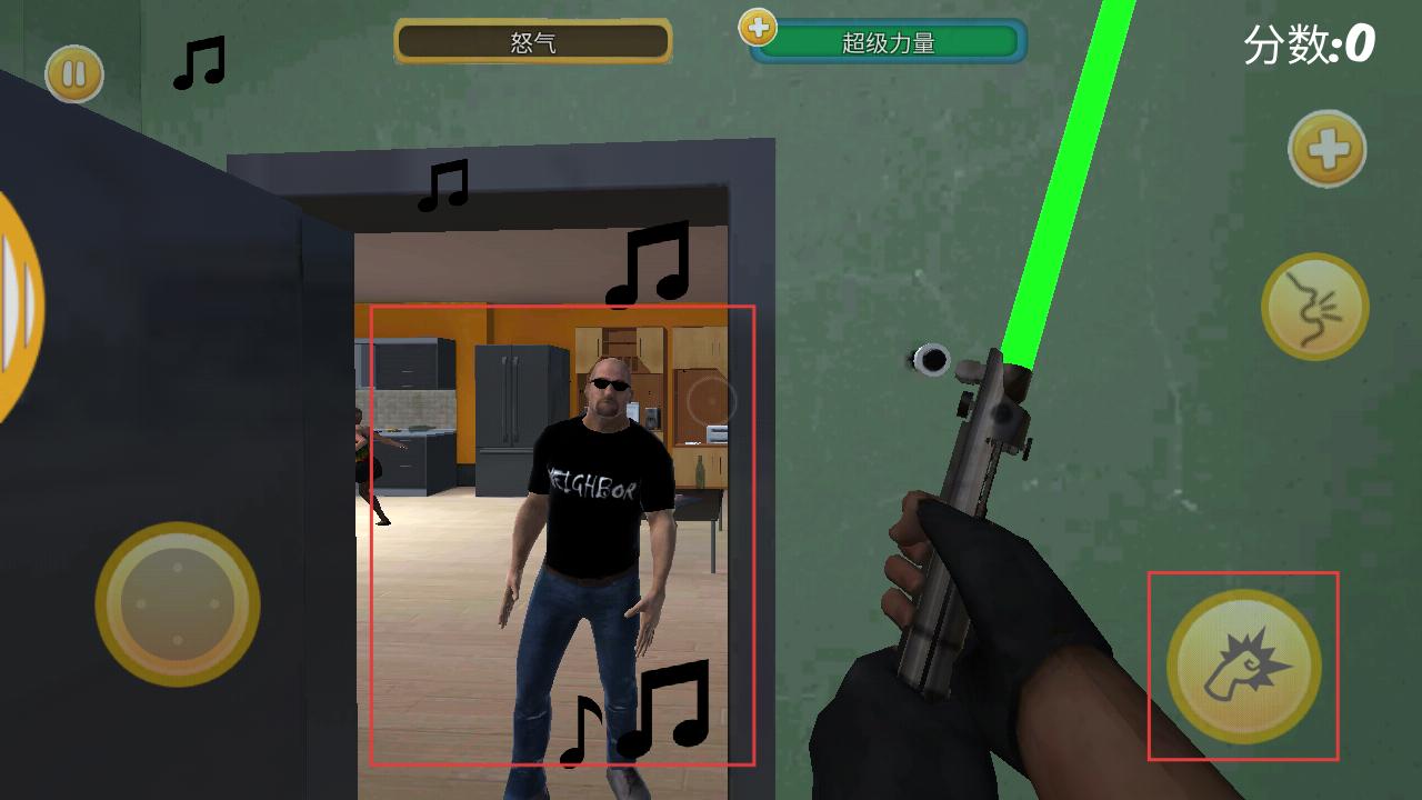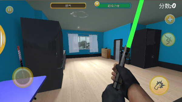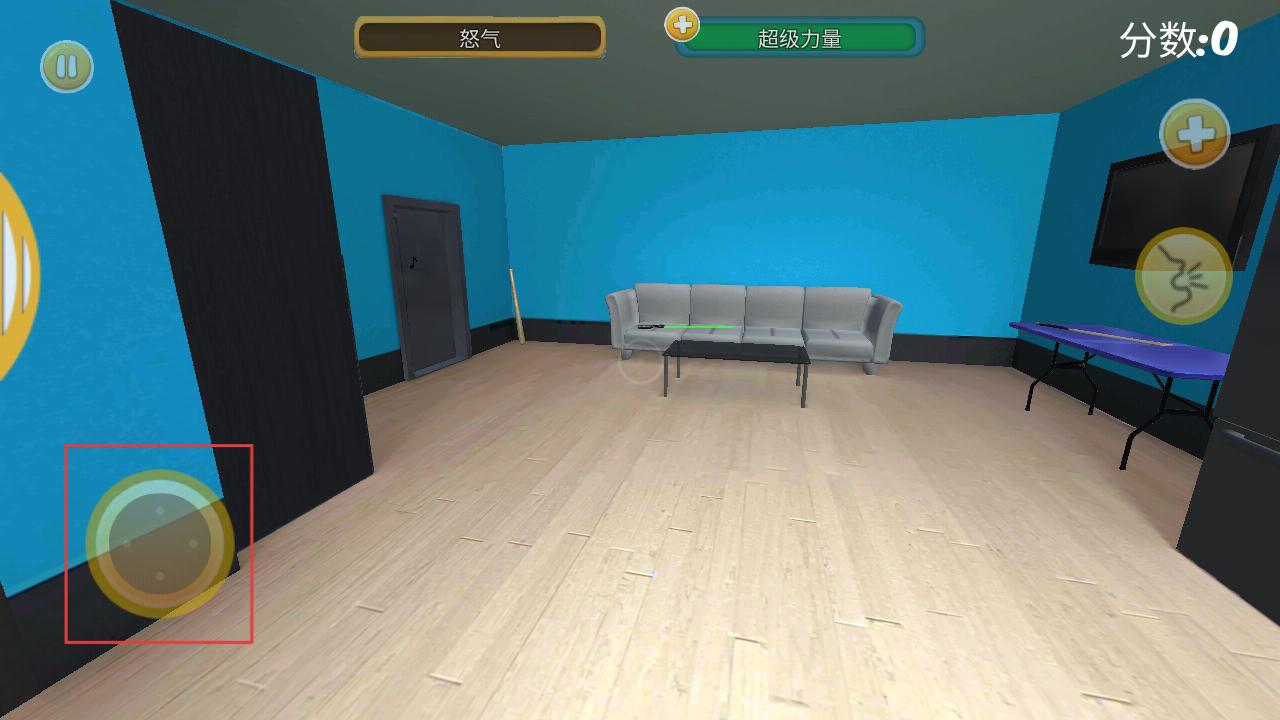 1、在场景中操控移动按钮,自由探索房间,寻找道具和邻居,开启暴揍解压的游戏进程。
