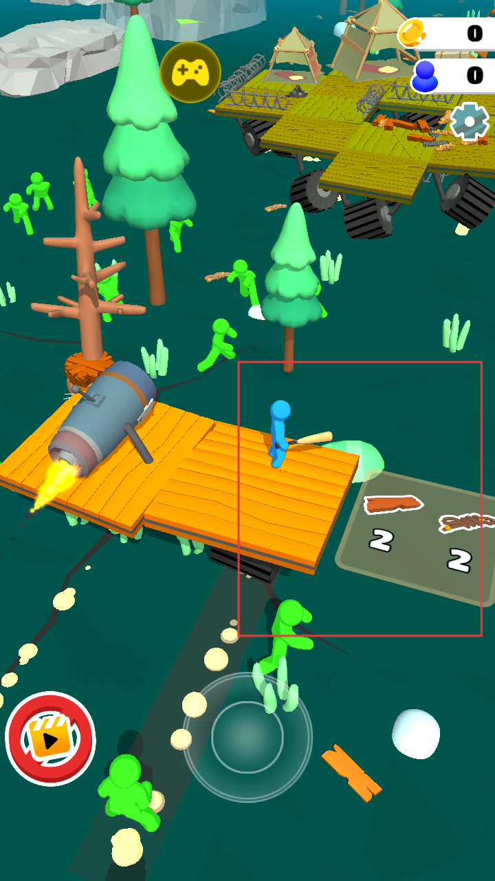 2、木筏安装发动机后可在水域行驶,躲避绿色僵尸的同时,继续探索收集资源,为木筏的发展和防御僵尸做准备。