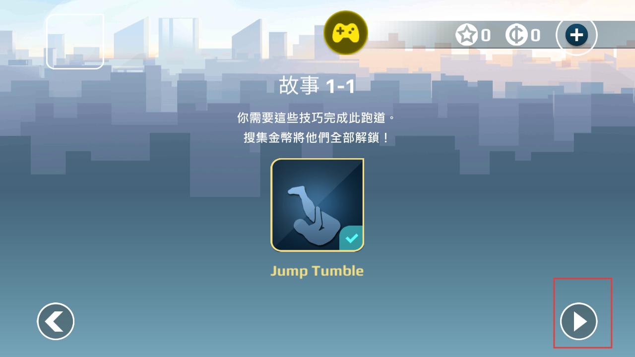 2、进入故事关卡,查看跑酷技巧提示,点击开始按钮,开启带有招式体系的跑酷挑战,收集金币可解锁更多跑酷技巧。