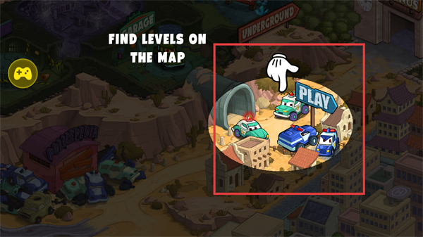 2、在地图界面寻找带有PLAY标识的关卡区域,点击进入,开启横版竞速与车辆乱斗的冒险之旅,选择关卡开始游戏。