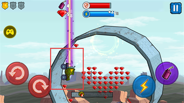 4、驾驶车辆在赛道上收集钻石,穿过环形障碍等地形,利用操作按钮调整车辆重心,借助道具提升战力,完成竞速挑战。