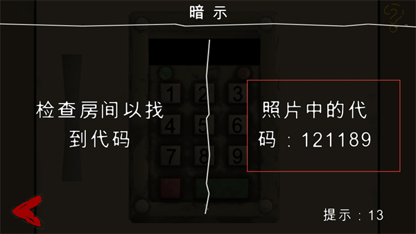 3、点击提示按钮,可看到照片中的代码121189的提示信息,收集到关键代码,为解开密码键盘谜题提供重要线索。