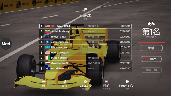 4、比赛结束后,若获得名次,点击继续即可开启下一场比赛,不断挑战自我,提升赛车竞技水平。