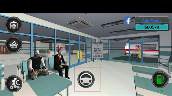 1、进入医院等候区场景,可见Add Funds按钮,还有方向盘样式的操控图标,旁有等候人员与救护车标识,准备开启急救驾驶的任务流程。