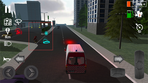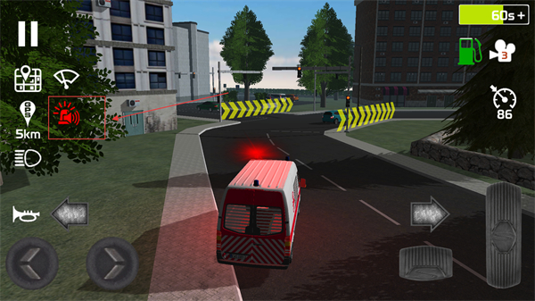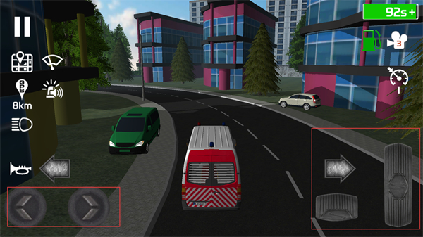 2、驾驶救护车行驶在城市道路,界面左侧设有左右方向控制按钮,右侧配备操控按键,周围有其他车辆,需平稳操控车辆行进。