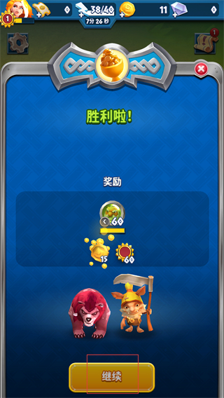 4、在胜利界面点击继续按钮,领取当前关卡的奖励,进入后续的游戏流程。