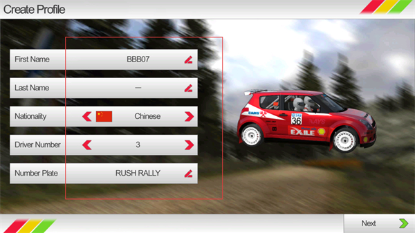 1、在CreateProfile界面填写信息,设置名字国籍等内容,确认后点击Next按钮,完成车手档案创建进入游戏。