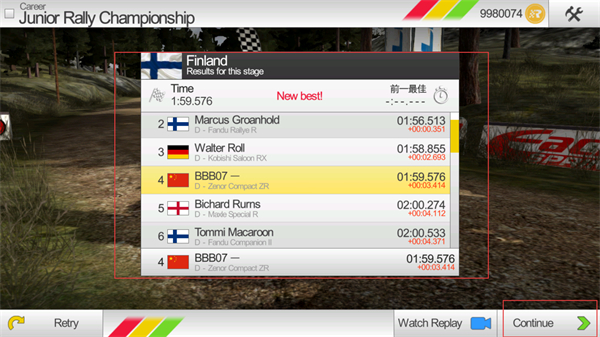 4、查看赛段成绩排名,确认自己的比赛用时,点击Continue按钮,推进到下一个赛事环节。