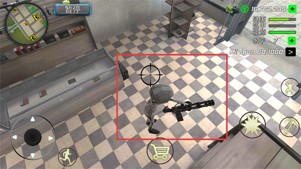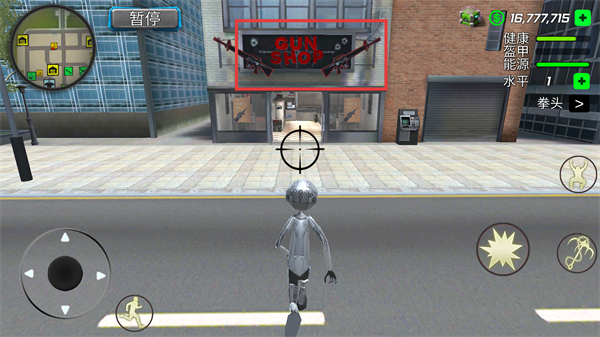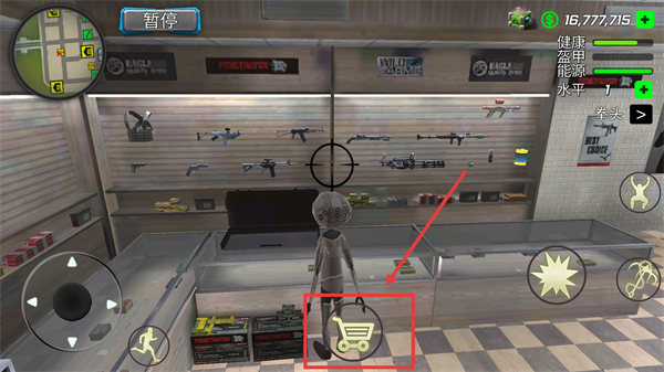 1、操控角色移动到标有GUN SHOP的店铺位置,靠近店铺入口,进入武器购买的场景。