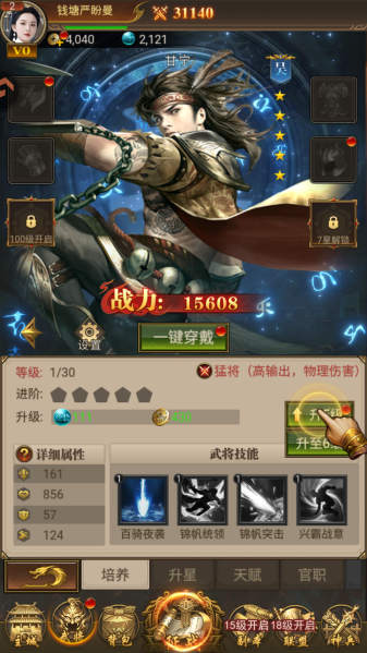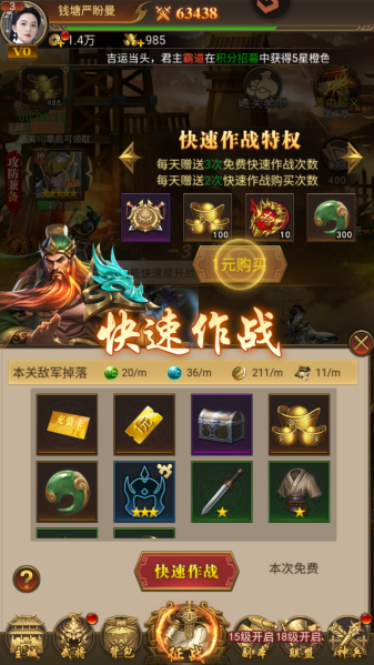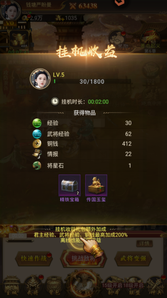 3、开挂机收益:通关最高关卡后开启离线挂机,上线优先领取资源用于武将升级强化。