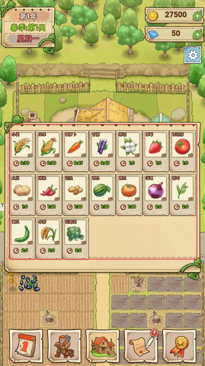 1、基础农业循环:开垦土地选择适宜种子播种,定期浇水除草直到成熟。使用肥料可提升作物品质,高品质产品能卖出更好价格。