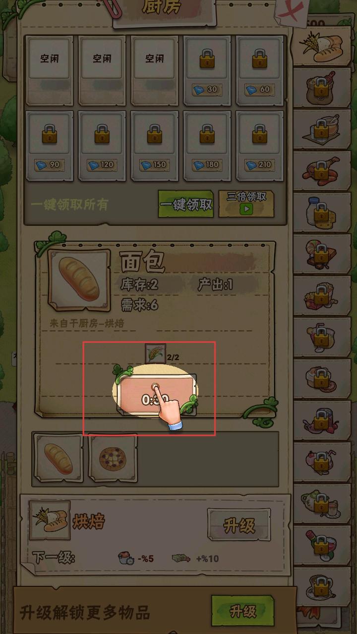 3、收获作物后可进入厨房,像用小麦就能制作面包,点击制作按钮,花费一定时间,就能得到面包等食品。