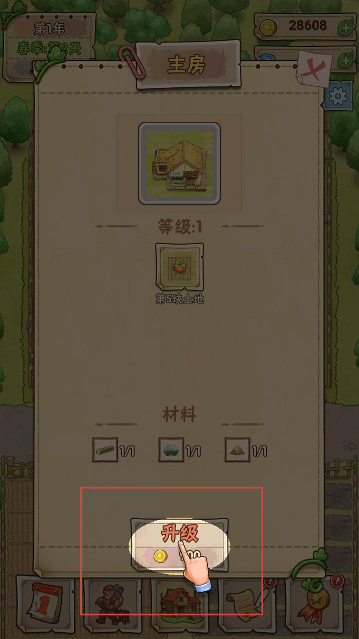 4、积累资源后还能对主房等建筑进行升级,点击升级按钮,消耗材料和金币,升级后能解锁更多农场内容。
