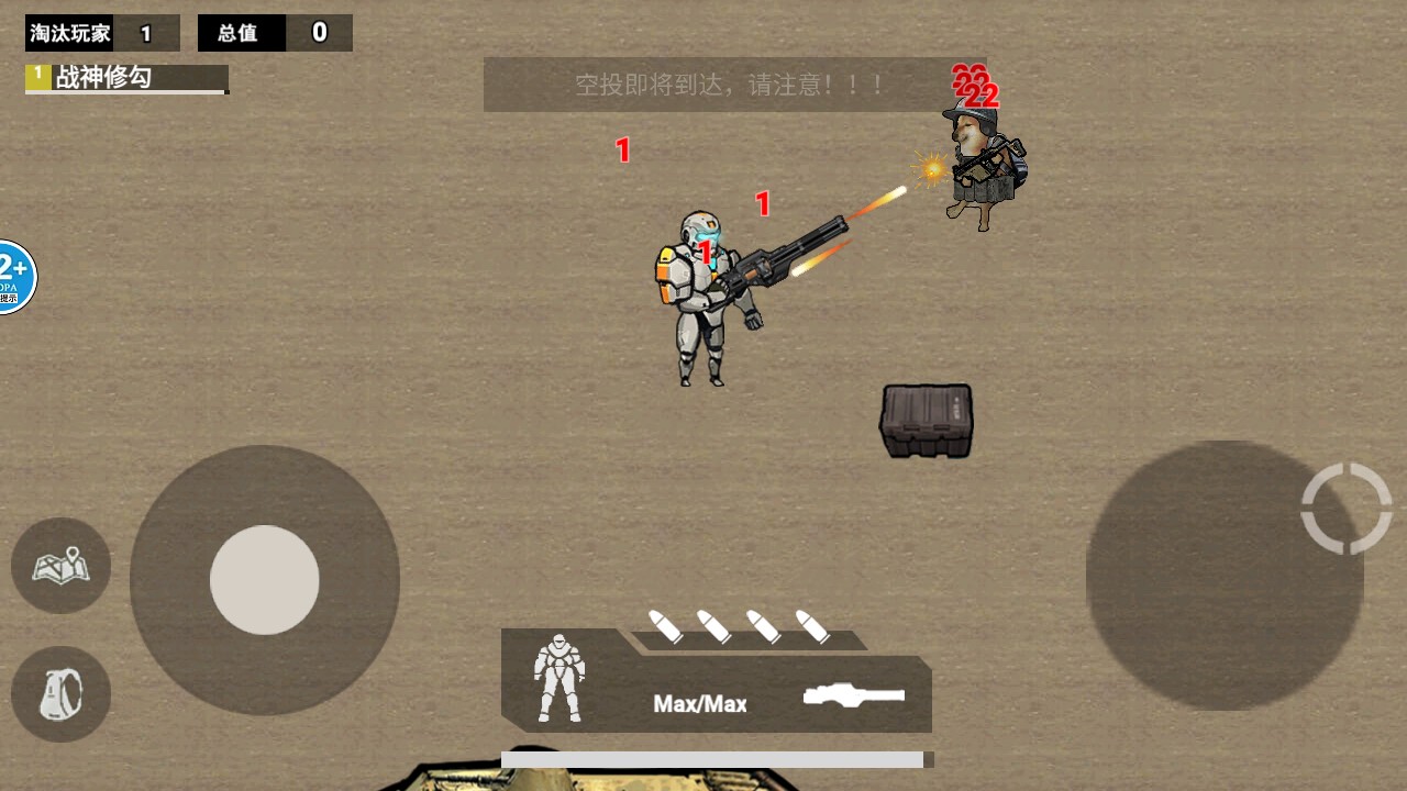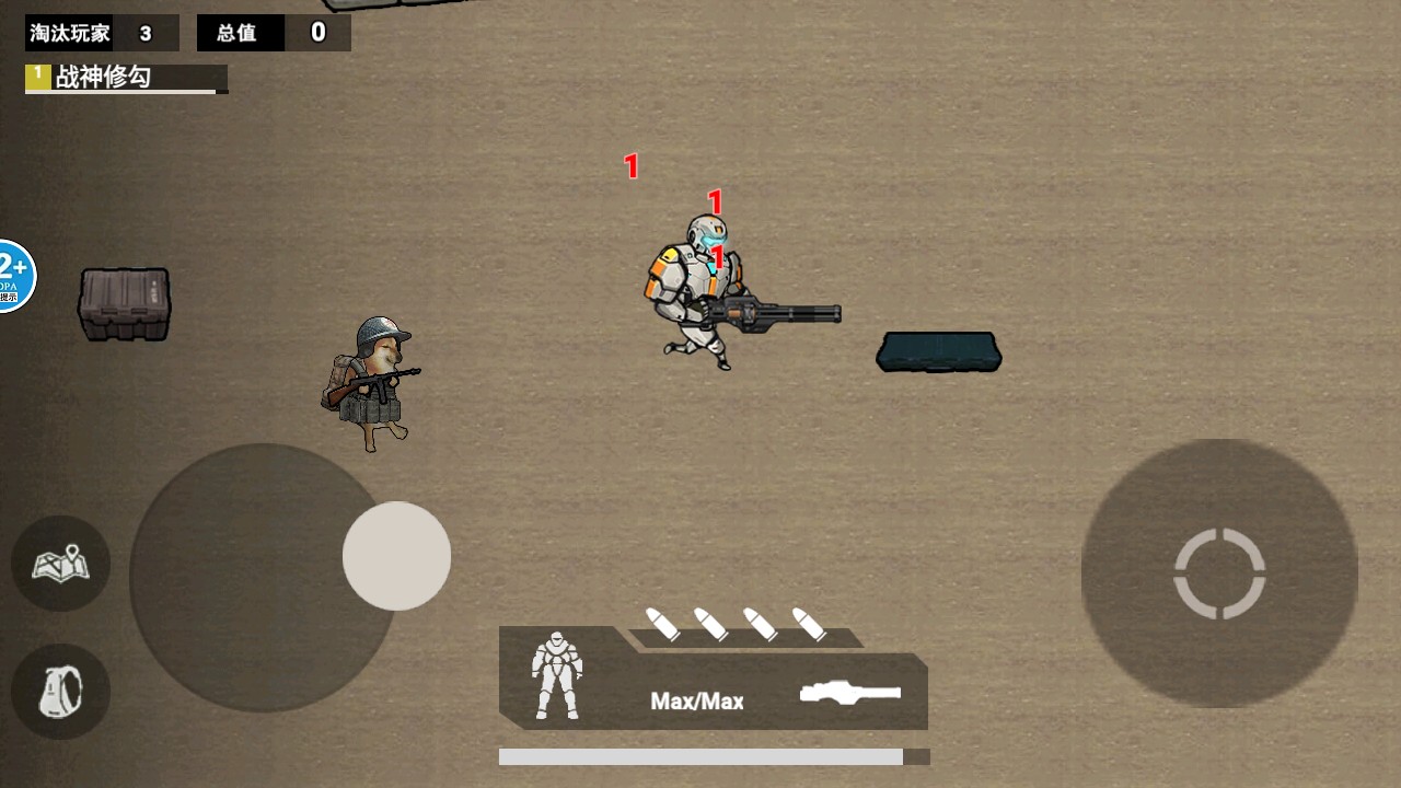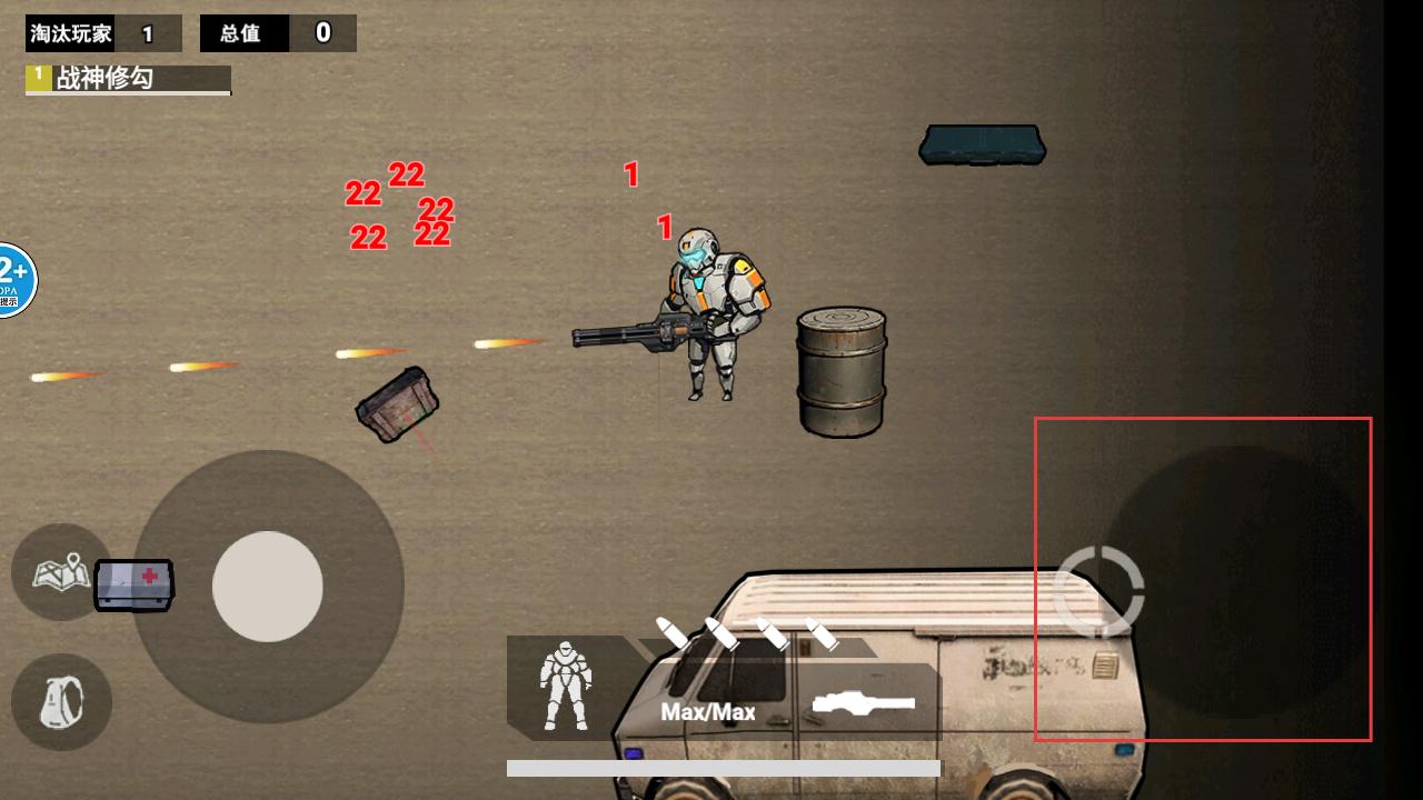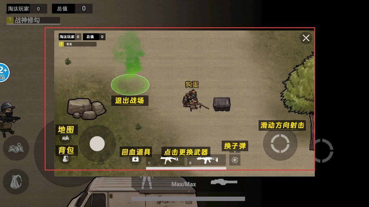2、在战场里能看到地图、背包等功能按钮,可滑动方向射击,还能更换武器、换子弹,利用这些操作与敌人对抗。
