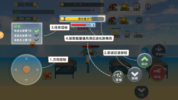 3、完成吸血:靠近目标后点击右下角“吸取”按钮,待能量条增长即完成基础操作与任务。