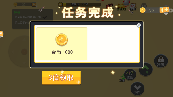 2、熟悉操控:左下角圆圈控制飞行方向,右侧箭头负责前进后退,关注红能量条与黄进化条。