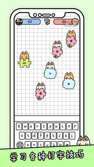 2、根据屏幕提示的文字内容快速打字,通过提升打字速度加快气球消除进度,争取在对决中占据优势,积累分数。