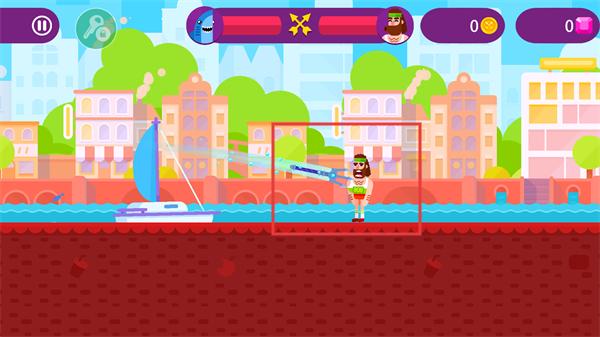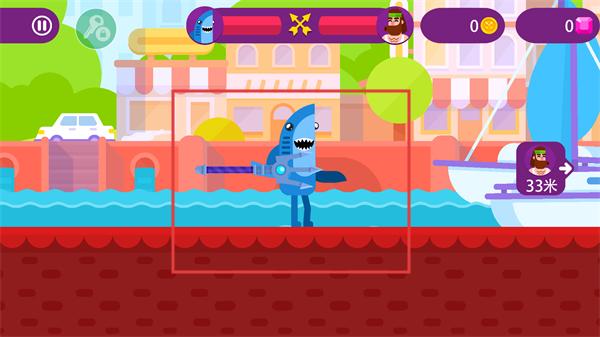 2、操控鲨鱼造型的弓箭手角色,在城市水域场景中移动,准备利用武器发起攻击,应对敌方挑战。
