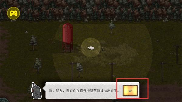 1、开局点击对勾确认对话,开启末日求生冒险,在像素风格的灾变世界中开始生存探索。