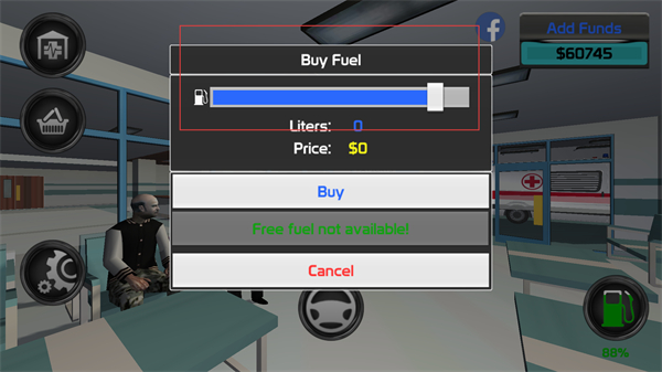 1、进入加油相关界面,看到Buy Fuel提示,界面有油量进度条显示Liters为0、Price为0,还有Buy和Cancel按钮,同时显示Free fuel not available的提示。