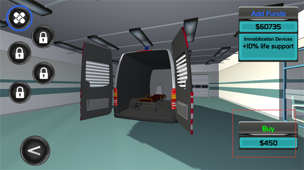 3、看到救护车后门处于开启状态,车厢内放置着担架,右侧显示immobilization Devices提示,还有Buy按钮标注450,部分设备呈锁定状态。