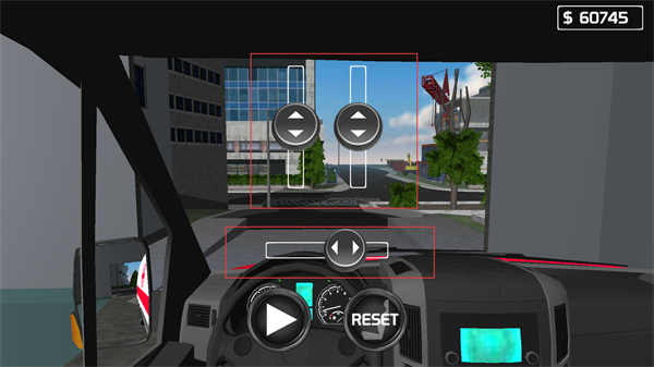4、进入救护车驾驶位界面,前方是城市道路场景,配有方向操控按钮,还有播放和RESET按钮,可准备启动车辆执行救援任务。