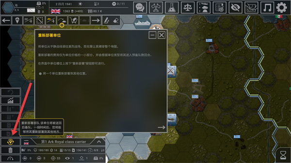 1、点击重新部署单位选项,查看该功能的说明,了解其对单位部署的调整规则,为后续战术调整做准备。