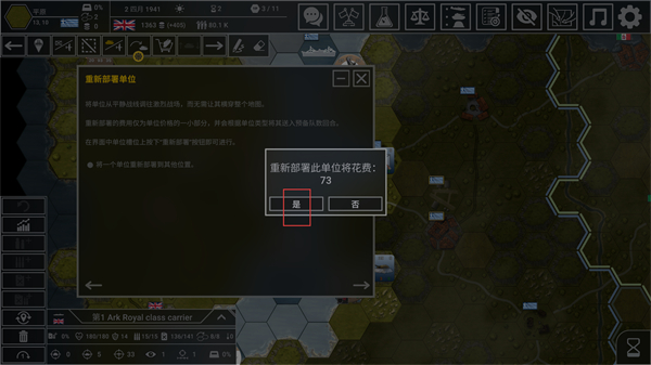 2、在重新部署单位的确认界面,点击是按钮,消耗对应资源来调整单位的部署位置,优化战场布局。