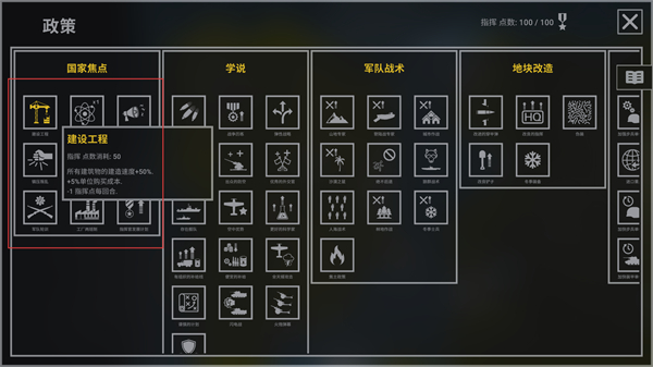 4、在政策界面选择国家焦点里的建设工程,解锁对应的国家增益,提升基建相关的效果,增强后勤能力。