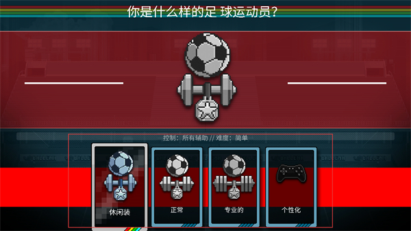 1、选择休闲玩家选项确定运动员类型,完成设置后进入游戏,准备开启这场像素风格的足球竞技之旅。