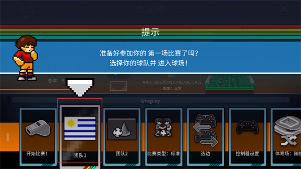 2、点击团队1选择乌拉圭队,完成球队挑选后,准备进入球场,开启你的第一场像素足球比赛。